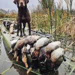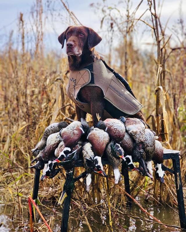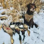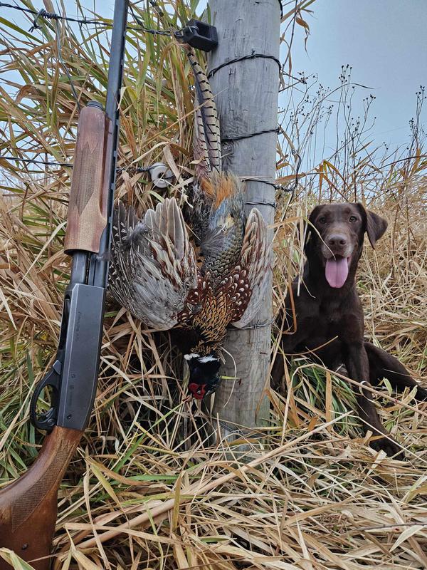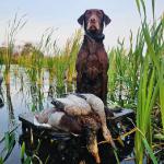 Bailey is a stylish chocolate female who is a lovely balance of intense drive and sensible disposition. She is Luke's dog and picks up a ton of ducks, geese, doves, and of course a few pheasants each season.